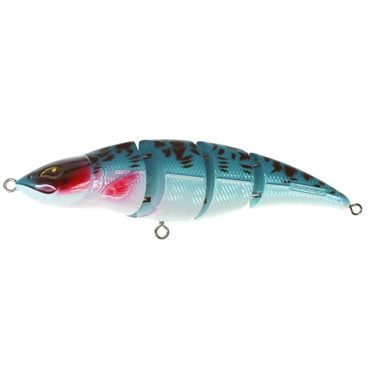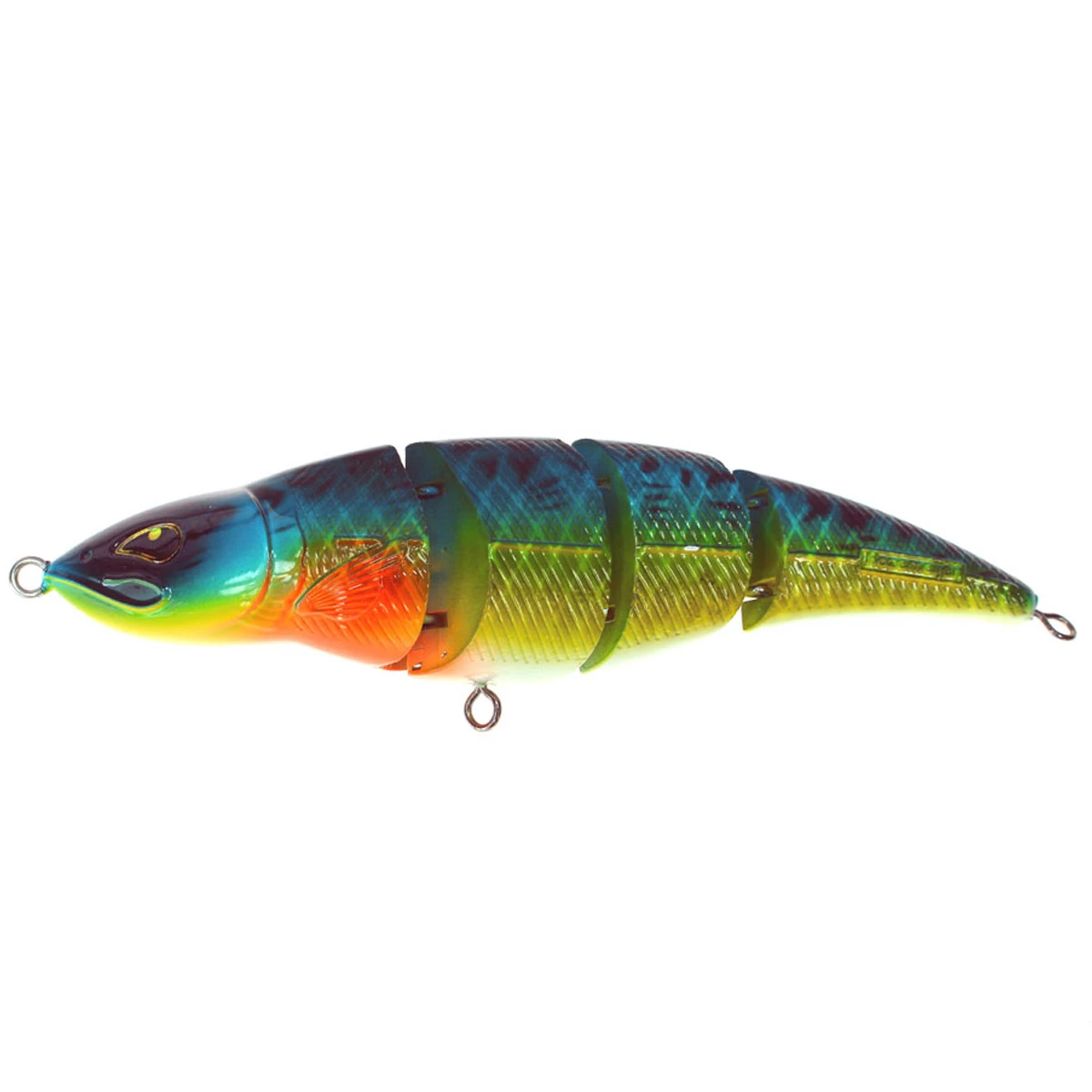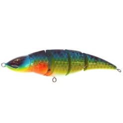 Deze 18 cm 4-delige swimbait zal u verbazen! De Fatal Attraction is op vele manieren te vissen namelijk, draai ‘m binnen en de aktie is al subliem maar ga je deze swimbait “”jerken”” dan krijg je een totaal ander stuk kunstaas. Doordat de Fatal Attraction zeer langzaam zinkt kunt u ‘m gewoon eventjes stil “”hangen””, tik ‘m zacht binnen en er ontstaat een zeer goede immitatie van een gewonde prooi. Daarnaast is de Fatal Attraction voorzien, zoals alle Rozemeijer pluggen van het unieke 360RSHS systeem. Dit houdt in dat de dreggen gewoon 360graden rond kunnen draaien waardoor het aantal “”lossers”” aanzienlijk zal dalen! Deze swimbait met fatale aantrekking voor onze vriend snoek maakt ‘m een vanger. Een topper voor de grote en dikke dames! Rozemeijer pro tip Fatal Attraction Deze swimbait, met zijn gewicht van 95gr, is feitelijk met iedere jerkbaithengel met een werpgewicht tot 100gr te werpen. Draai je deze swimbait binnen, dan zal deze gracieus terug zwemmen, waarbij de kop lichtelijk schudt en de interne kogels flink wat geluid zullen maken. Wil je over planten heen vissen? Lift je hengeltop omhoog en vis de Fatal Attraction sub-surface, maar schrik niet van het geweld waarmee de snoeken hem komen halen! Echter als je de Fatal Attraction uitwerpt en gewoon binnen draait doe je jezelf tekort! Vis de Fatal Attraction eens jerkend of twitchend. Terwijl je binnen aan het draaien bent, geef korte rukken met je hengel, stop even, geef weer een ruk, en draai dan weer binnen. De swimbait zal dan dartelende bewegingen maken, afzinken, weer omhoog schieten en dat zal zelfs een argwanende rover over de streep trekken! Trollend is de swimbait perfect over waterplanten en rotsen heen te vissen. Aan de ondiepe kant op de rivier is er geen betere swimbait te vinden die zinkend is. Wil je hem wat dieper aanbieden, monteer een wartelloodje voor de swimbait en deze zal automatisch dieper gaan. Een perfecte techniek voor die koudere winterdagen. Gebruik je de Fatal Attraction, zorg dan dat je een lange onthaaktang en kniptang bij de hand hebt, want de rovers willen er nog wel eens flink overheen schuiven.